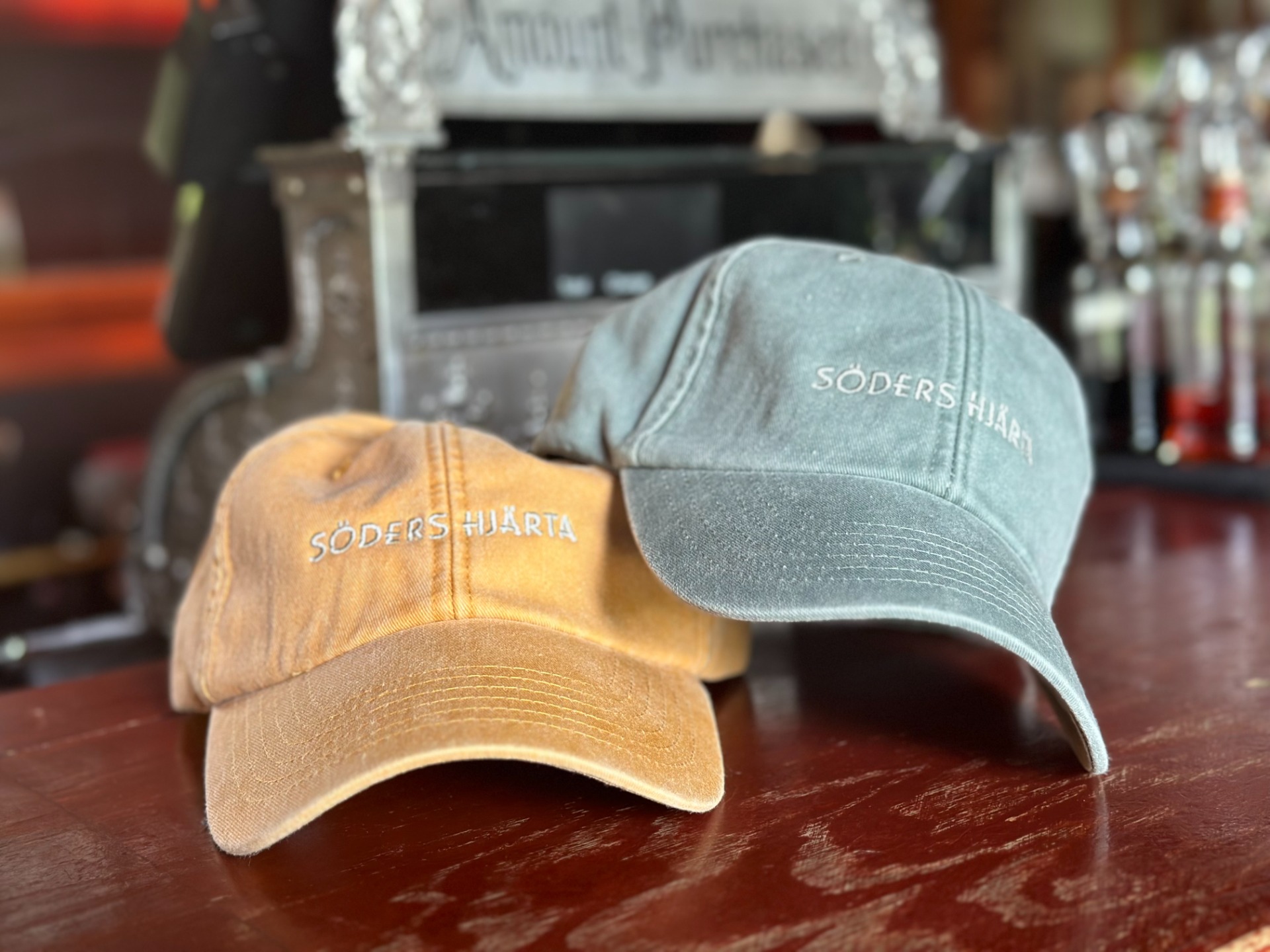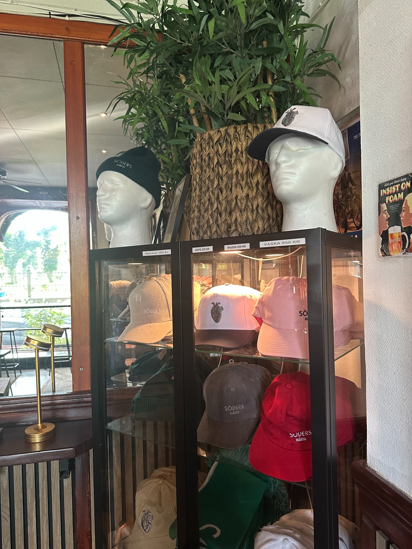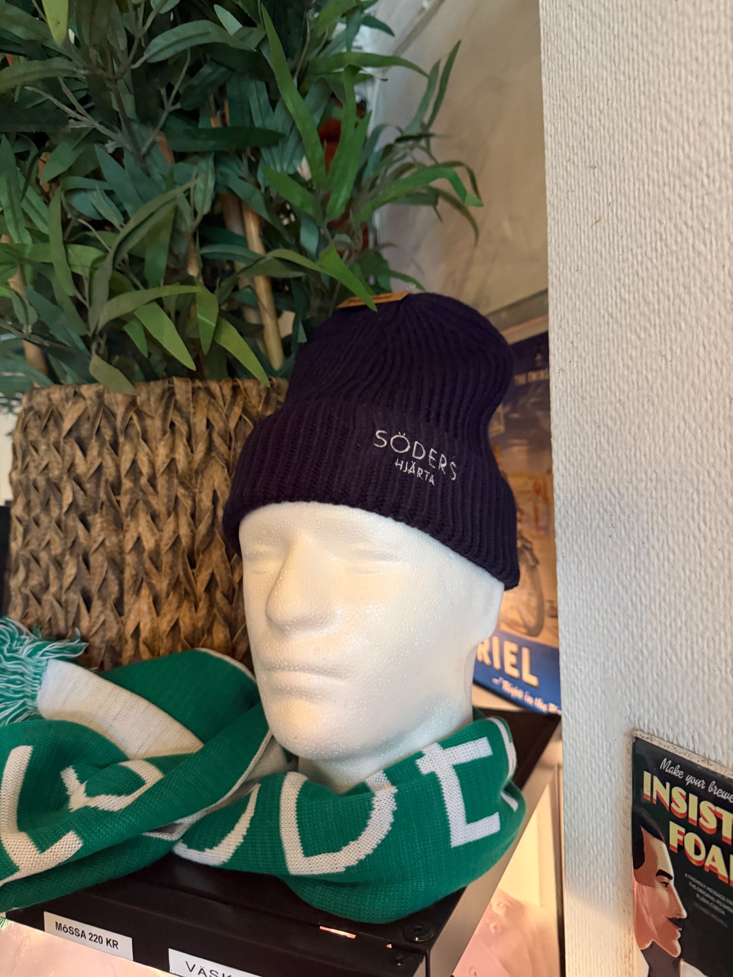 We have a cabinet full of merch: caps, beanies, scarves, scented candles, and backpacks.